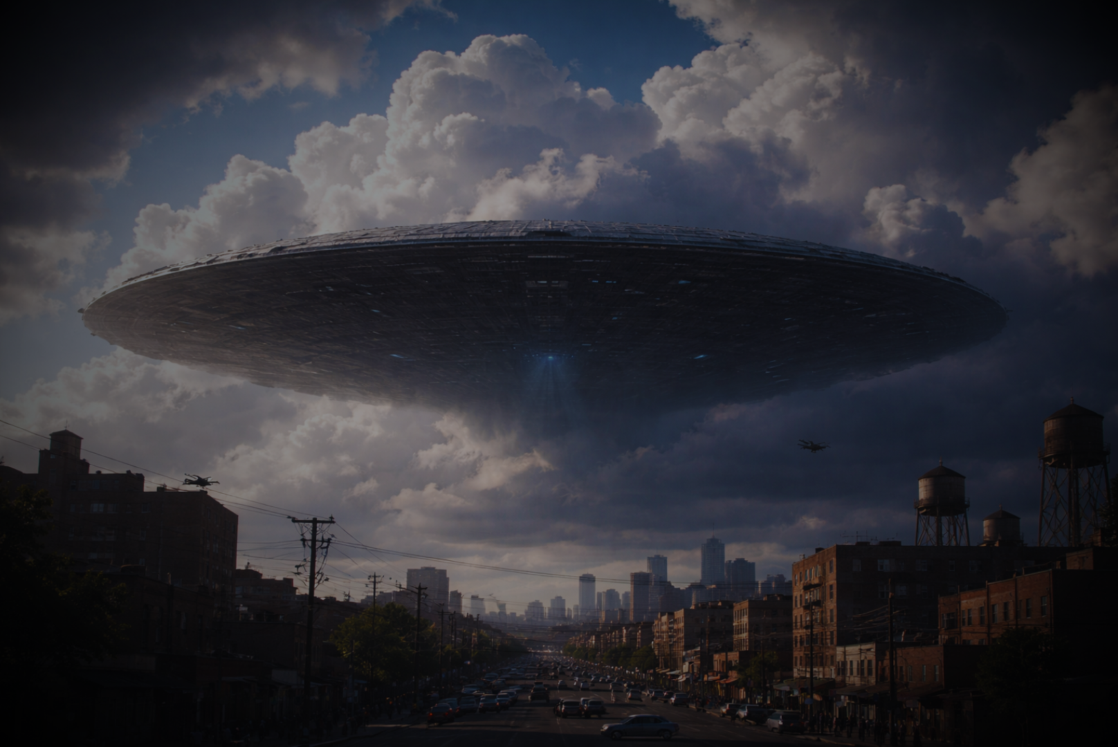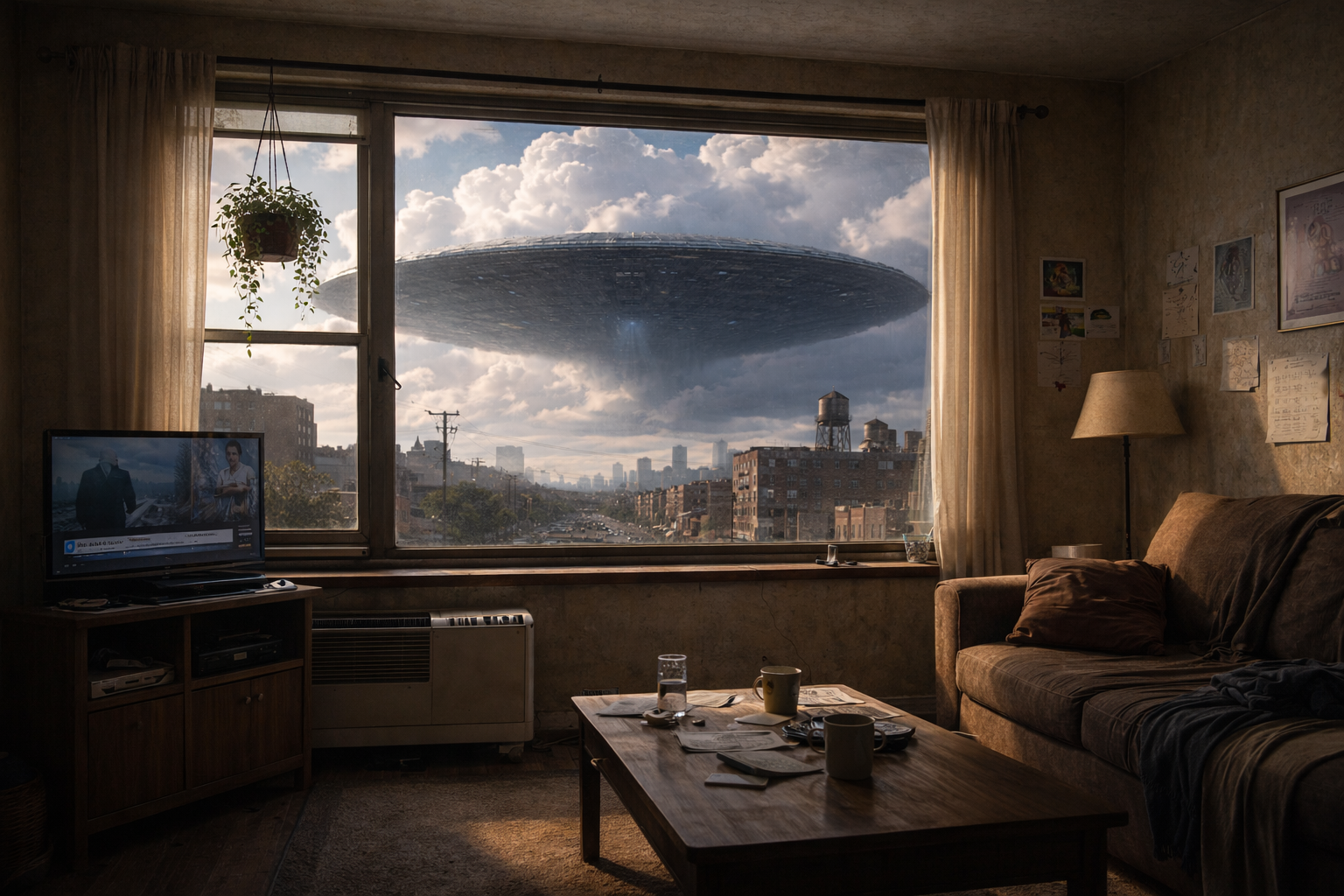 Weeks into an alien presence that has become impossible to ignore and yet disturbingly routine, life in the city continues beneath a massive craft still suspended above the skyline. Patrols pass. News cycles repeat. People adapt.